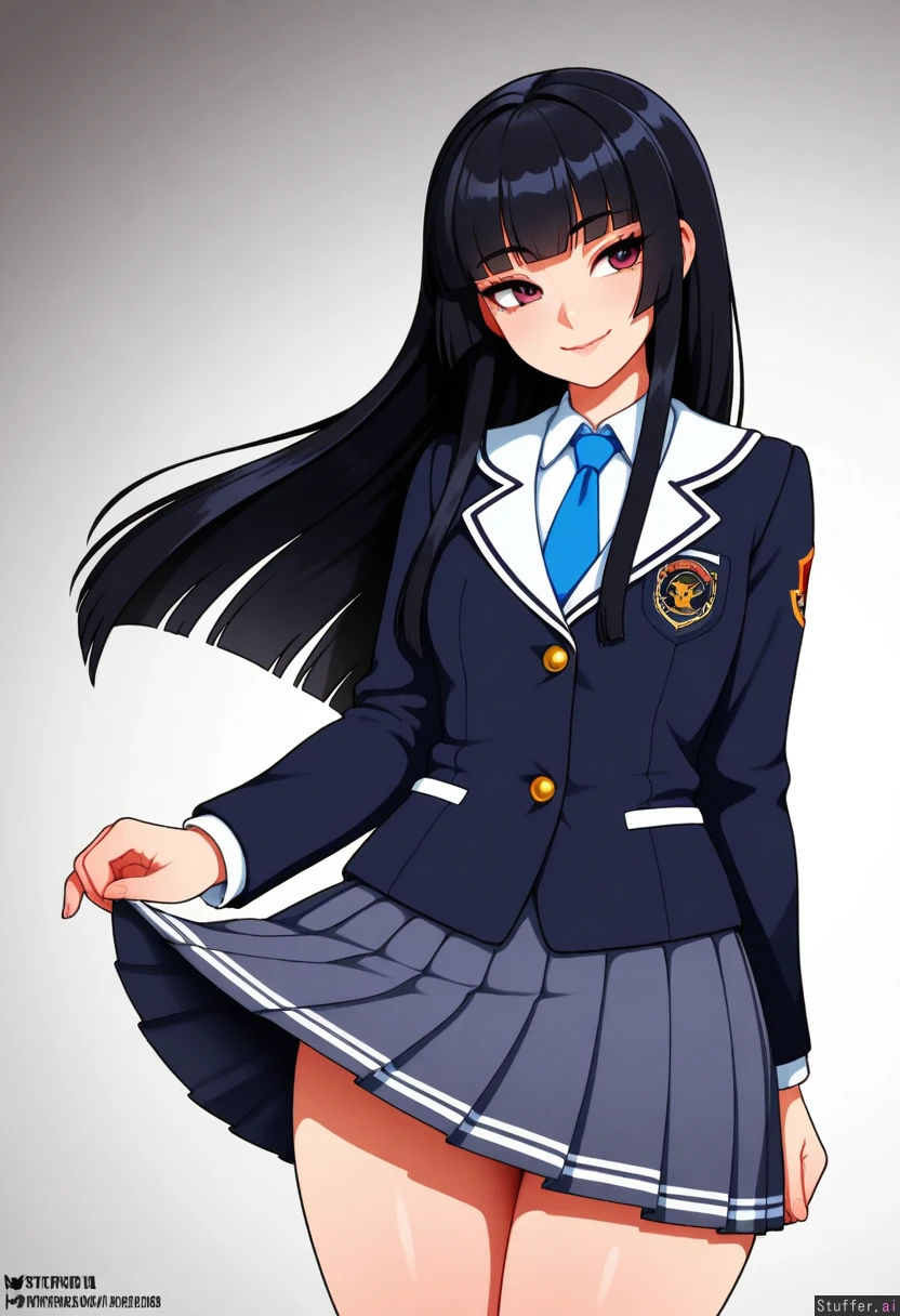 Nyantcha /(Artist/), Neocoill /(Artist/), Orristerioso /(Artist/), 1 Girl, Asian, black hair, Hime cut Hair, Academy Uniform, Pleated Skirt, Blue Tie, Black Blazer, Slim, White Background, Flirty Smile,