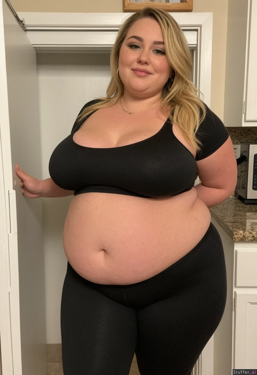 blonde solo girl, green eyes, freckles, long messy hair, sharp nose, high cheekbones, seductive smile, big full lips, double chin, eye-shadow, lipstick, blush, necklace, earrings (black tight crop top), (((black tight_low_waisted leggings))) voluptueus, (extra-sized, super-sized), big_ass, fat, weight gain kitchen, walking to the fridge in a sensual way, opening the fridge (full_body shot) (fatter:2)