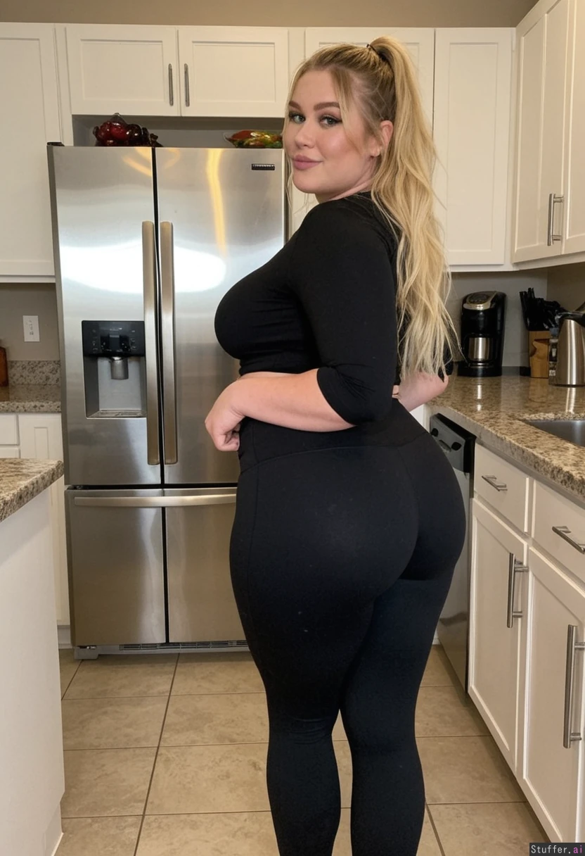 blonde solo girl, green eyes, freckles, long messy hair, sharp nose, high cheekbones, seductive smile, big full lips, double chin, eye-shadow, lipstick, blush, necklace, earrings (black tight crop top), (((black tight_low_waisted leggings))) voluptueus, (extra-sized, super-sized), big_ass kitchen, walking to the fridge in a sensual way, opening the fridge (full_body shot) (oversized chubby:1.2)