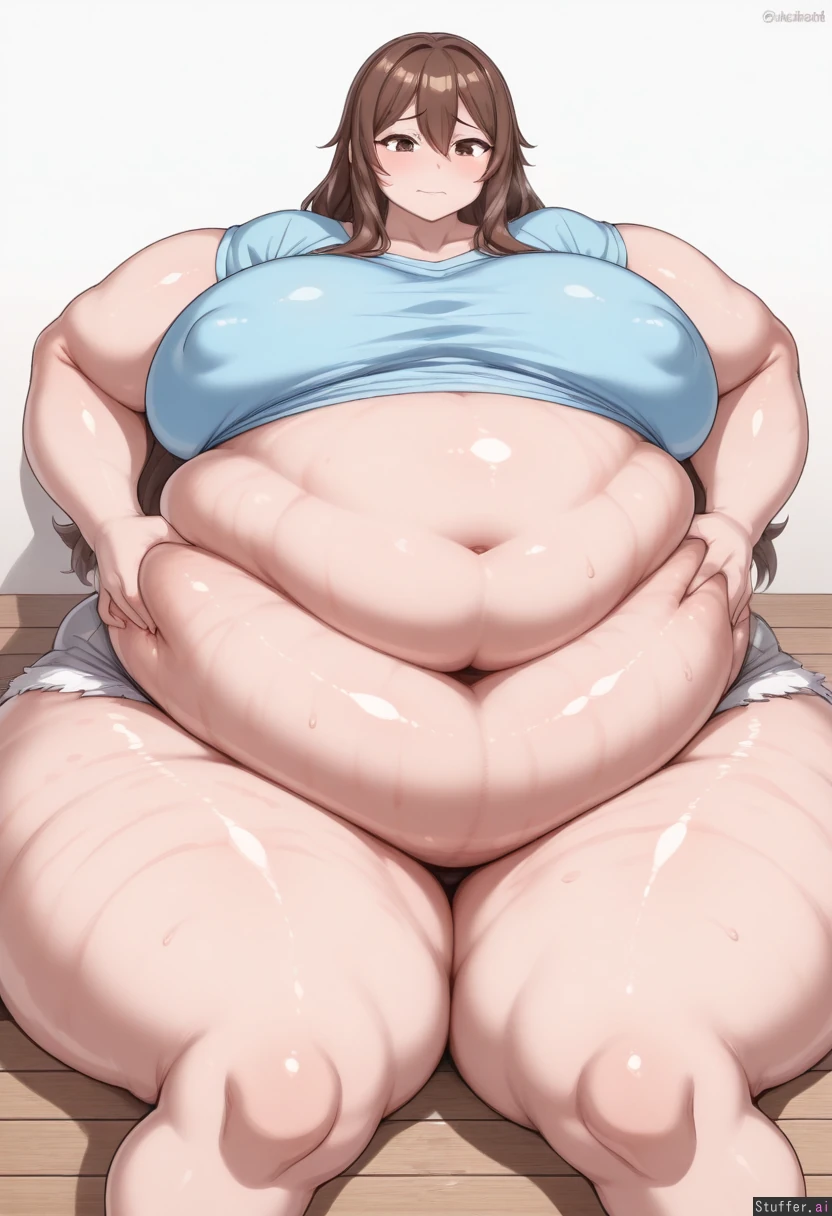 A 23 y/o immobile adult, wearing a blue sweater with brown hair, long hair. her clothes are ripping. sexy, hot, sweating, steamy_breath, massive_belly, massive_thighs, big_breasts, slob, sagging_belly, skindentation, fat_rolls, fat_folds, belly_fat, sloshing_belly, obese, chubby, ssbbw, wide_body, voluptuous_belly, immense massive voluptuous belly, immense wide body, hyper obese, tearing_clothes, ripped_clothes, 400_lbs, soft_arms, gigantic_fat, jiggling, wobbling, ripped_shirt, ripped_pants, nipples pressing against shirt, insanely fat, sweaty, morbidly obese, gigantic_belly, gigantic_thighs, spilling_belly, massive_thighs, humongous_belly, extremely_obese, extreme_obesity, heavy_blush, overflowing_belly, wide_belly, wibe_breasts, huge_breasts, hyper_morbidly_obese, torn_clothes, ussbw, extremely_hyper_obese, immensely_obese, huge_hyper_belly, huge_hyper_thighs, hyper_breasts, standing, immense_breasts, immense_ass, stuck, huge_fat_arms, fatty, big_belly, (ultra_gigantic_belly:1.5), (almost_immobile:1.5), (stretch_marks:1.5), (hyper morbidly obese overweight woman:1.9), (fat_arms:1.9), (immobile:1.9), (sitting_on_floor:1.9), (cant_move:1.9), (belly crushing body:1.9) (struggling_to_move:1.9), (hyper massive protruding belly:1.5) (Fat breasts:0) (Potbelly:0.0), (Bellyrolls:0.0) (massive_belly:2) (morbidly_obese:2) (humongous_thighs:2)