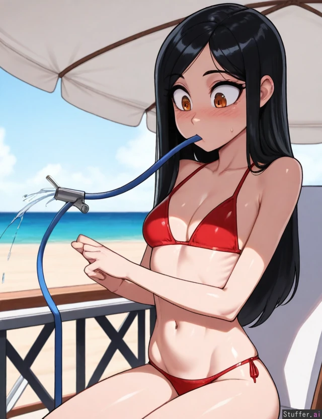 (nyantcha:1.2), (krekkov:1.3), (reiq:1.1), (kittew:1.2), 8k, high resolution, maximum pixel density, masterpiece, (((highly detailed))), ((flawless)), (((high rating))), ((highly detailed face)), full resolution, 8k, high resolution, best quality, detailed eyes, ((solo)) Appearance: Long straight black hair with light blue stripes, beautiful amber eyes, pale skin, freckles, blushing heavily, anime-woman, shocked expression, happy, tall, Outfit: red bikini Location: sitting in chair, at beach, side-view, looking down at self, hose in mouth Modifiers: (Slim body:1.8), (enormous round breasts:1.0), (morbidly obese ssbbw:1.05), (big butt:1.0)