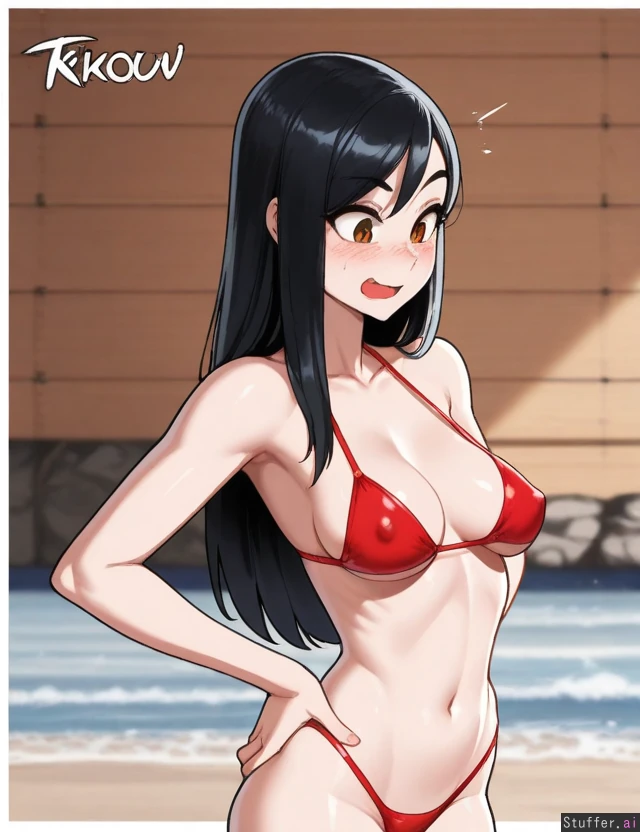 (nyantcha:1.2), (krekkov:1.3), (reiq:1.1), (kittew:1.2), 8k, high resolution, maximum pixel density, masterpiece, (((highly detailed))), ((flawless)), (((high rating))), ((highly detailed face)), full resolution, 8k, high resolution, best quality, detailed eyes, ((solo)) Appearance: Long straight black hair with light blue stripes, beautiful amber eyes, pale skin, freckles, blushing heavily, anime-woman, shocked expression, happy, tall, erect nipples, underboob Outfit: red bikini Location: standing, at beach, side-view, looking down at self, hands on hips Modifiers: (Slim body:1.85), (enormous round breasts:0.85), (morbidly obese ssbbw:1.0), (big butt:1.0)