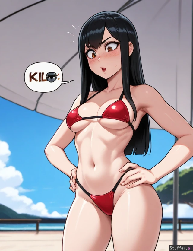 (nyantcha:1.2), (krekkov:1.3), (reiq:1.1), (kittew:1.2), 8k, high resolution, maximum pixel density, masterpiece, (((highly detailed))), ((flawless)), (((high rating))), ((highly detailed face)), full resolution, 8k, high resolution, best quality, detailed eyes, ((solo)) Appearance: Long straight black hair with light blue stripes, beautiful amber eyes, pale skin, freckles, blushing heavily, anime-woman, shocked expression, happy, tall, erect nipples, underboob Outfit: red bikini Location: standing, at beach, side-view, looking down at self, hands on hips Modifiers: (Slim body:1.8), (enormous round breasts:0.87), (morbidly obese ssbbw:1.0), (big butt:1.0)
