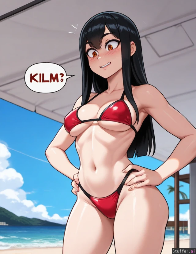 (nyantcha:1.2), (krekkov:1.3), (reiq:1.1), (kittew:1.2), 8k, high resolution, maximum pixel density, masterpiece, (((highly detailed))), ((flawless)), (((high rating))), ((highly detailed face)), full resolution, 8k, high resolution, best quality, detailed eyes, ((solo)) Appearance: Long straight black hair with light blue stripes, beautiful amber eyes, pale skin, freckles, blushing heavily, anime-woman, shocked expression, happy, tall, erect nipples, underboob Outfit: red bikini Location: standing, at beach, side-view, looking down at self, hands on hips Modifiers: (Slim body:1.75), (enormous round breasts:0.89), (morbidly obese ssbbw:1.0), (big butt:1.0)