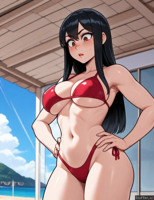 (nyantcha:1.2), (krekkov:1.3), (reiq:1.1), (kittew:1.2), 8k, high resolution, maximum pixel density, masterpiece, (((highly detailed))), ((flawless)), (((high rating))), ((highly detailed face)), full resolution, 8k, high resolution, best quality, detailed eyes, ((solo)) Appearance: Long straight black hair with light blue stripes, beautiful amber eyes, pale skin, freckles, blushing heavily, anime-woman, shocked expression, embarrassed, tall, erect nipples, underboob Outfit: red bikini Location: standing, at beach, side-view, looking down at self, hands on hips Modifiers: (Slim body:1.65), (enormous round breasts:0.92), (morbidly obese ssbbw:1.0), (big butt:1.0)