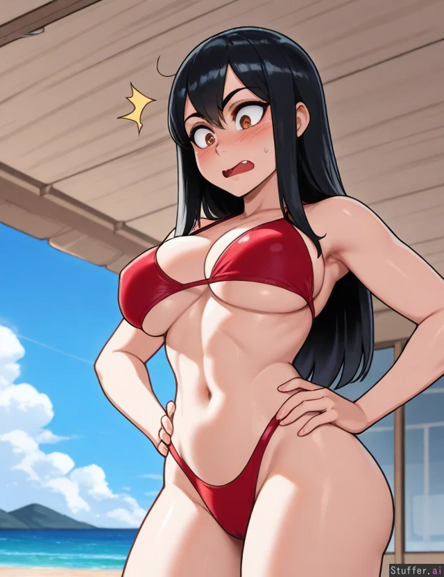 (nyantcha:1.2), (krekkov:1.3), (reiq:1.1), (kittew:1.2), 8k, high resolution, maximum pixel density, masterpiece, (((highly detailed))), ((flawless)), (((high rating))), ((highly detailed face)), full resolution, 8k, high resolution, best quality, detailed eyes, ((solo)) Appearance: Long straight black hair with light blue stripes, beautiful amber eyes, pale skin, freckles, blushing heavily, anime-woman, shocked expression, embarrassed, tall, erect nipples, underboob Outfit: outgrown red bikini Location: standing, at beach, side-view, looking down at self, hands on hips Modifiers: (Slim body:1.6), (enormous round breasts:0.94), (morbidly obese ssbbw:1.0), (big butt:1.0)