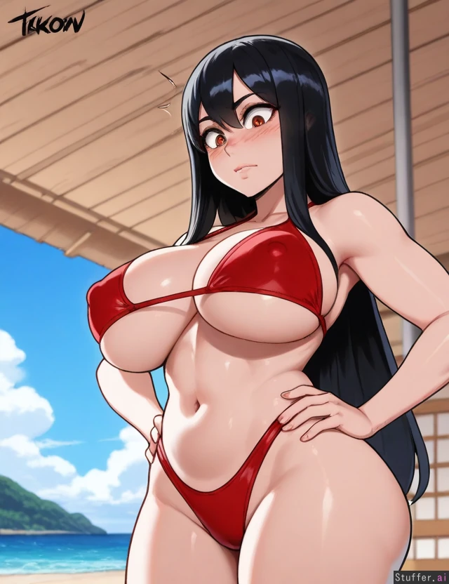 (nyantcha:1.2), (krekkov:1.3), (reiq:1.1), (kittew:1.2), 8k, high resolution, maximum pixel density, masterpiece, (((highly detailed))), ((flawless)), (((high rating))), ((highly detailed face)), full resolution, 8k, high resolution, best quality, detailed eyes, ((solo)) Appearance: Long straight black hair with light blue stripes, beautiful amber eyes, pale skin, freckles, blushing heavily, anime-woman, shocked expression, embarrassed, tall, (erect nipples), underboob Outfit: outgrown red bikini Location: standing, at beach, side-view, looking down at self, hands on hips Modifiers: (Slim body:1.42), (enormous round breasts:1.0), (morbidly obese ssbbw:1.0), (big butt:1.0)