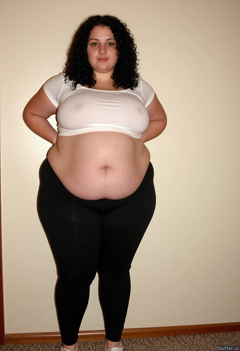 beautiful Obese Italian girl, 30 years old, thick curly black hair, short, very thin, waist, wearing a wite top and black leggins, full clothed,