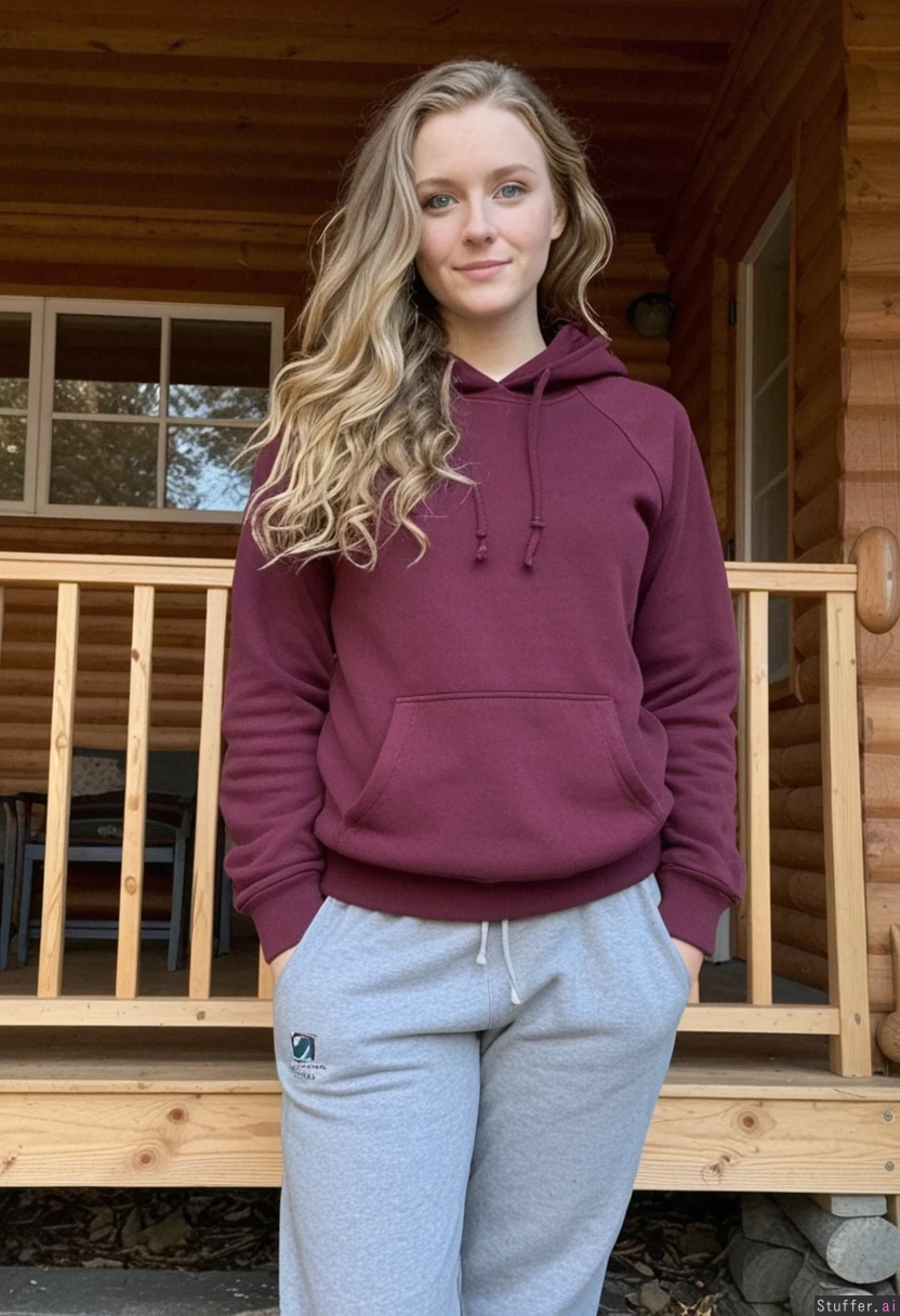 dark_blonde blue_eyes wavy_hair wearing_grey_sweatpants_and_maroon_hooded_sweatshirt standing_on_porch_of_log_cabin in_adirondacks_in_autumn weight_gain