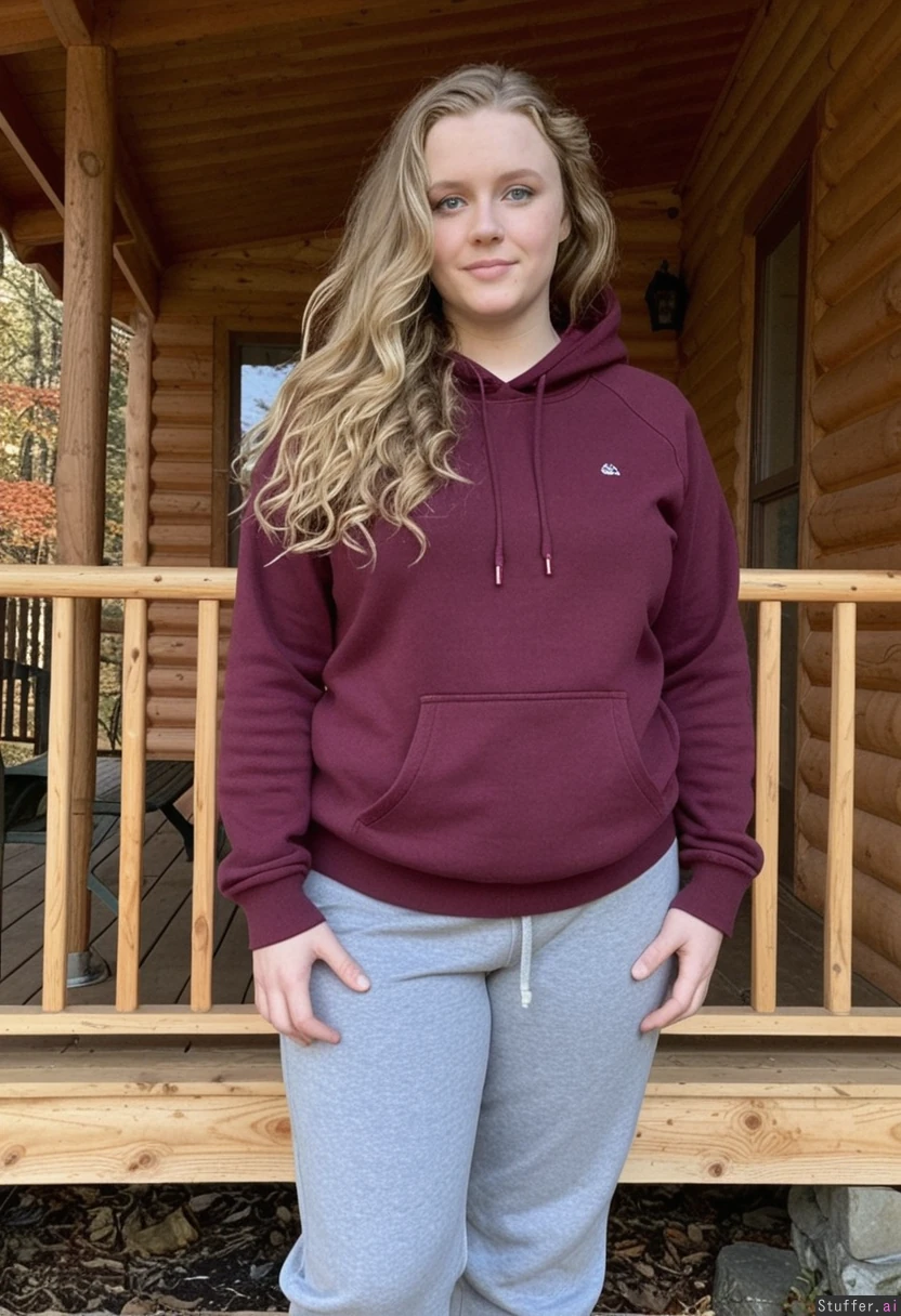 dark_blonde blue_eyes wavy_hair wearing_grey_sweatpants_and_maroon_hooded_sweatshirt standing_on_porch_of_log_cabin in_adirondacks_in_autumn weight_gain weight_gain weight_gain