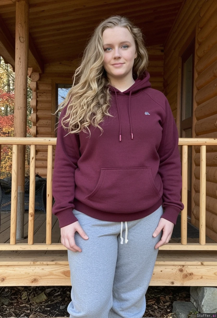 dark_blonde blue_eyes wavy_hair wearing_grey_sweatpants_and_maroon_hooded_sweatshirt standing_on_porch_of_log_cabin in_adirondacks_in_autumn weight_gain weight_gain weight_gain weight_gain