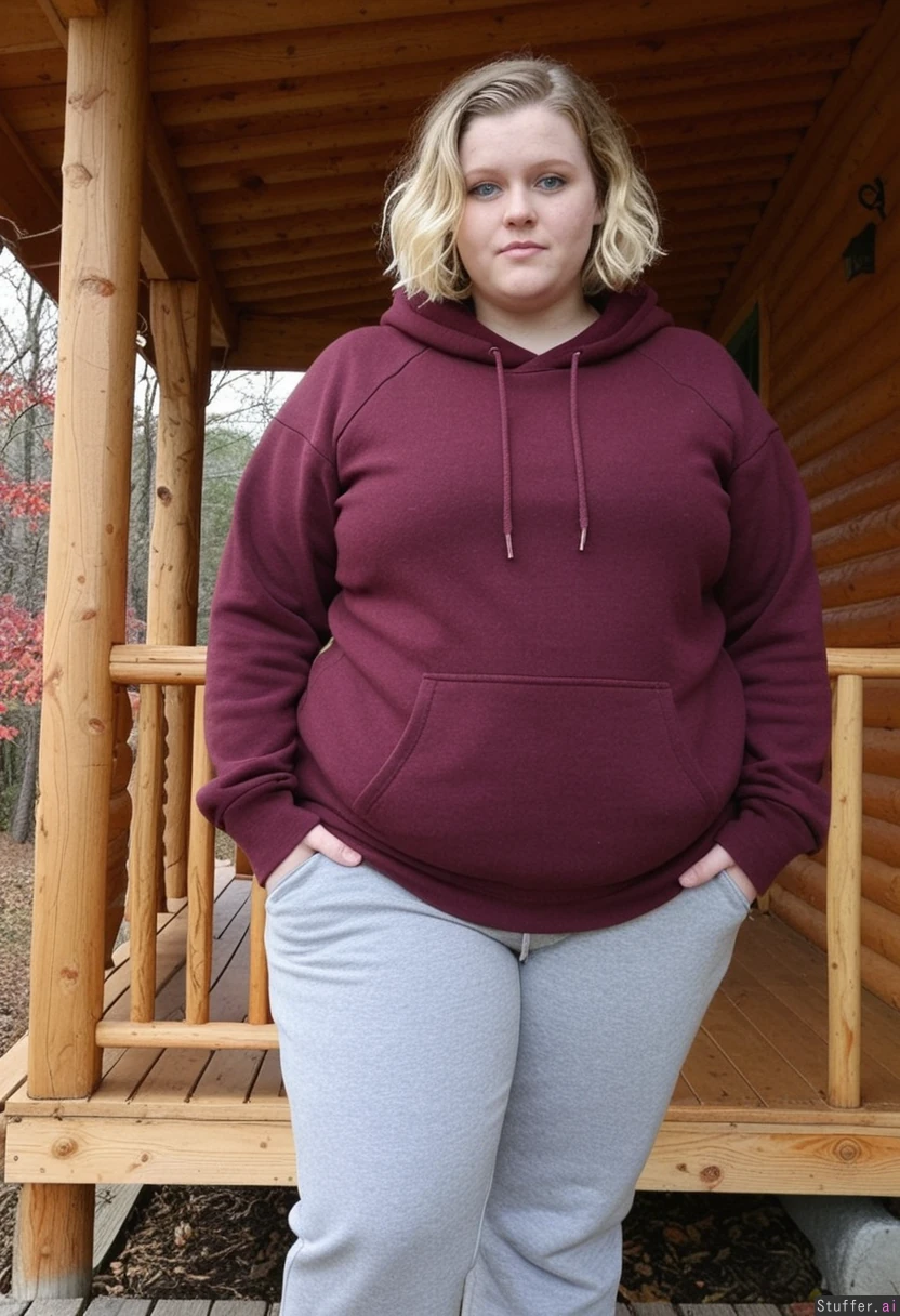 dark_blonde blue_eyes short_wavy_bob_hair wearing_grey_sweatpants_and_maroon_hooded_sweatshirt standing_on_porch_of_log_cabin in_adirondacks_in_autumn weight_gain weight_gain weight_gain weight_gain gain_weight gain_weight gain_weight grow_fat grow_fat grow_fat grow_fat grow_huge_fat