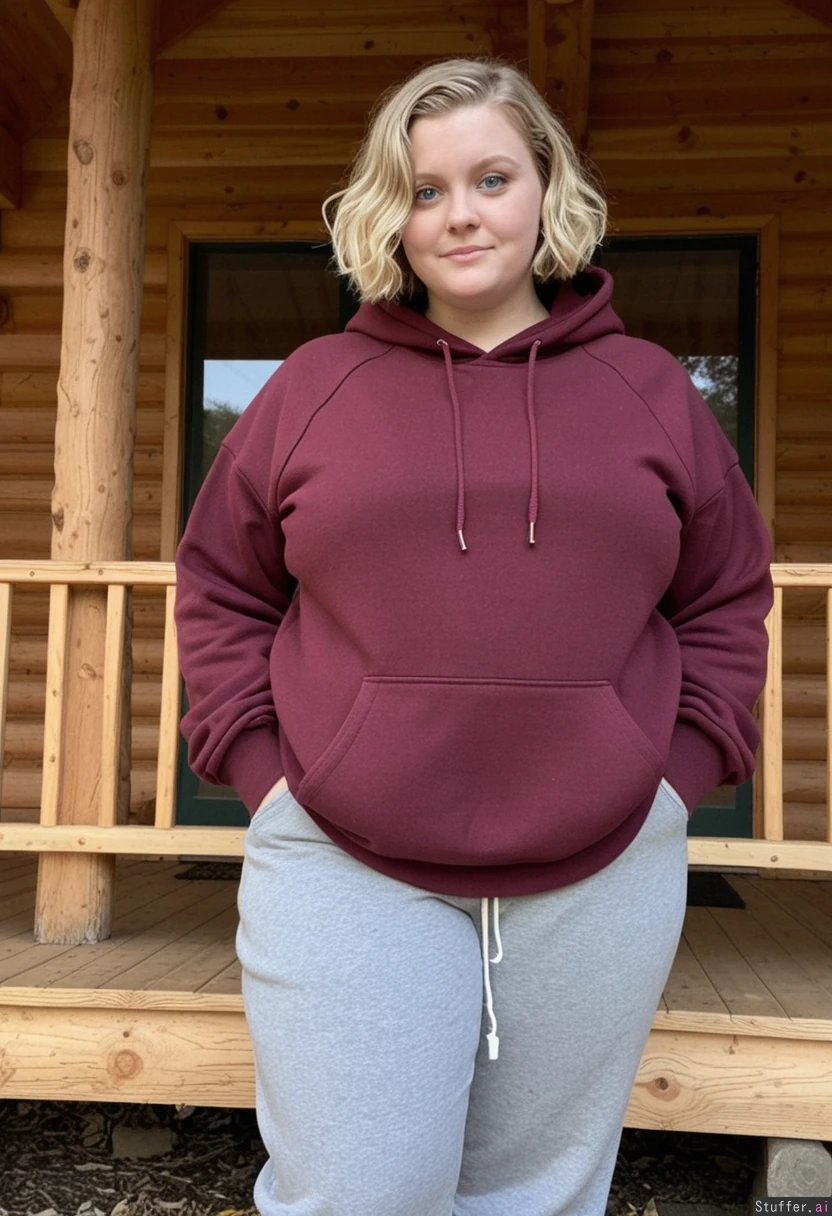 dark_blonde blue_eyes short_wavy_bob_hair wearing_grey_sweatpants_and_maroon_hooded_sweatshirt standing_on_porch_of_log_cabin in_adirondacks_in_autumn weight_gain weight_gain weight_gain weight_gain gain_weight gain_weight gain_weight grow_fat grow_fat grow_fat grow_fat grow_fat dark_blonde blue_eyes short_wavy_bob_hair wearing_grey_sweatpants_and_maroon_hooded_sweatshirt obese