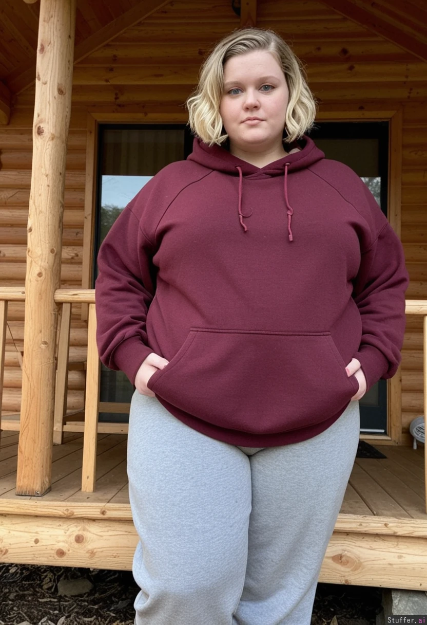 dark_blonde blue_eyes short_wavy_bob_hair wearing_grey_sweatpants_and_maroon_hooded_sweatshirt standing_on_porch_of_log_cabin in_adirondacks_in_autumn weight_gain weight_gain weight_gain weight_gain gain_weight gain_weight gain_weight grow_fat grow_fat grow_fat grow_fat grow_fat dark_blonde blue_eyes short_wavy_bob_hair wearing_grey_sweatpants_and_maroon_hooded_sweatshirt obese obese grow_fat bigger bigger bigger