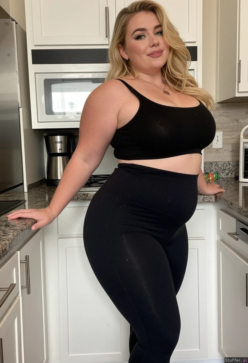 blonde solo girl, green eyes, freckles, long messy hair, sharp nose, high cheekbones, seductive smile, big full lips, double chin, eye-shadow, lipstick, blush, necklace, earrings (black tight crop top), (((black tight_low_waisted leggings))) voluptueus, (extra-sized, super-sized), big_ass kitchen, walking to the fridge in a sensual way, opening the fridge (full_body shot) (weight gain) ((chubby:0.7)) ((belly 0.7)) ((wide hips 0.7)) ((thick things 0.7))
