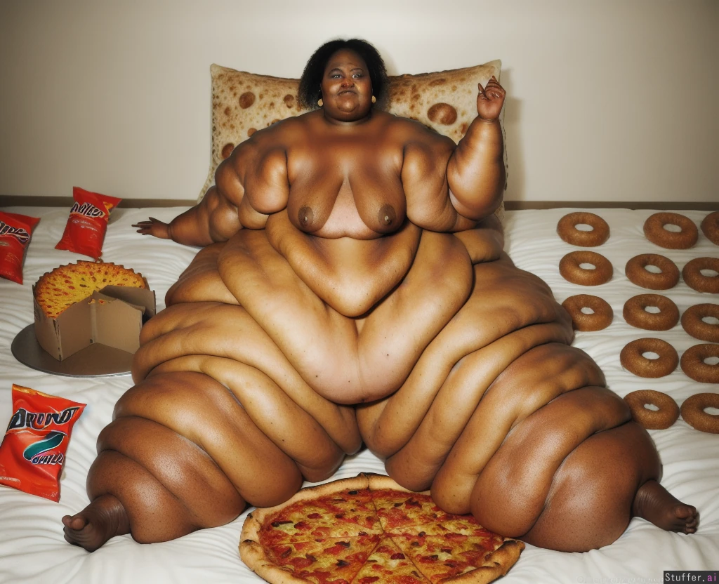 Photo realistic, ultra high quality, african ssbbw, beautiful face:1.4, (ultra double chin:1.9), (ultra fat face:1.9), (ultra huge legs:1.9), (ultra huge arms:1.9), (ultra leg rolls:1.7), bare feet:1.4, naked, sitting on a bed, surounded by dounts, pizza, cake, and doritos bags