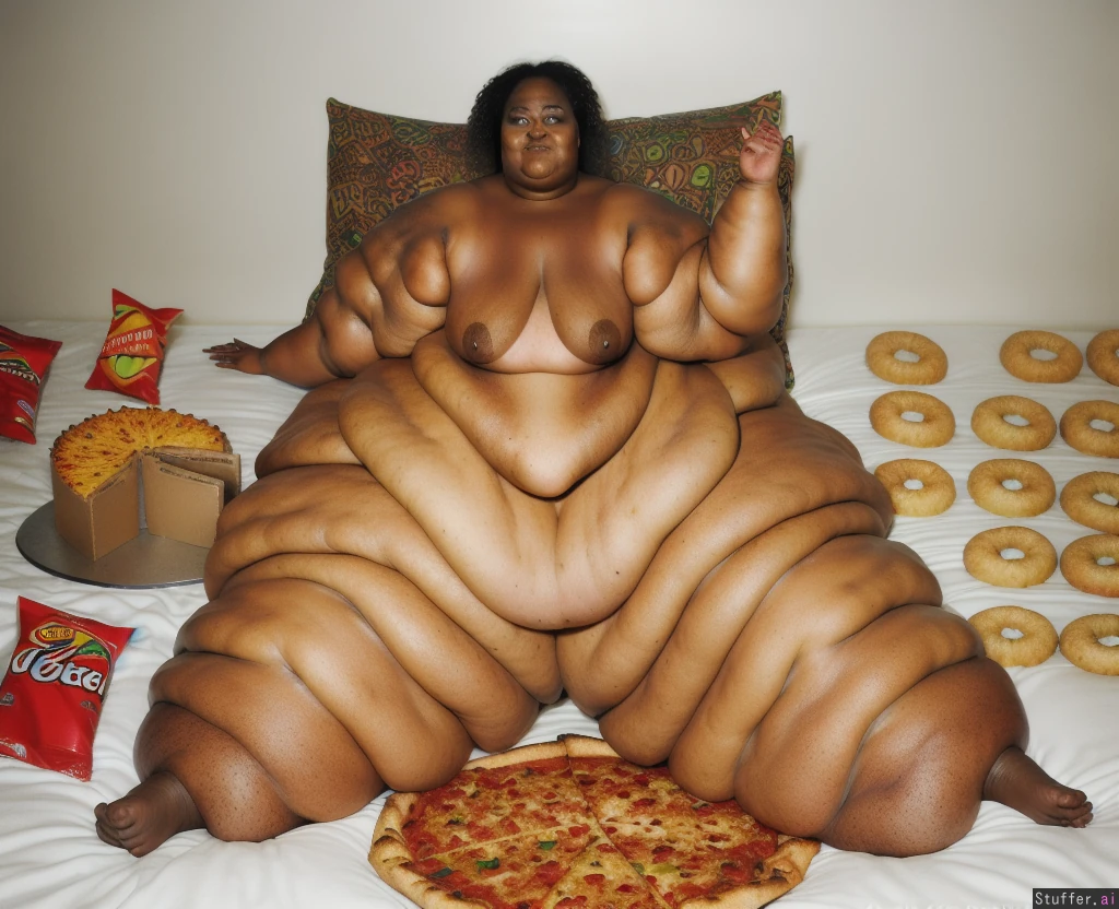 Photo realistic, ultra high quality, african ssbbw, beautiful face:1.4, (ultra double chin:1.9), (ultra fat face:1.9), (ultra huge legs:1.9), (ultra huge arms:1.9), (ultra leg rolls:1.7), bare feet:1.4, naked, sitting on a bed, surounded by dounts, pizza, cake, and doritos bags