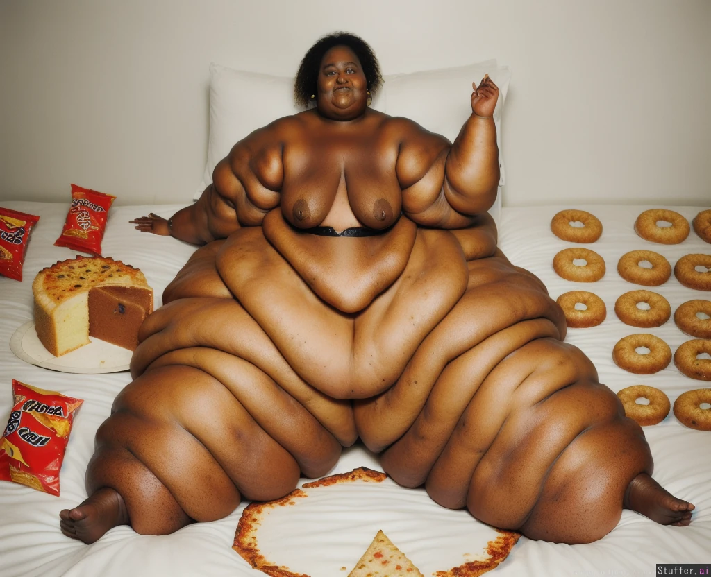 Photo realistic, ultra high quality, african ssbbw, beautiful face:1.4, (ultra double chin:1.9), (ultra fat face:1.9), (ultra huge legs:1.9), (ultra huge arms:1.9), (ultra leg rolls:1.7), bare feet:1.4, naked, sitting on a bed, surounded by dounts, pizza, cake, and doritos bags