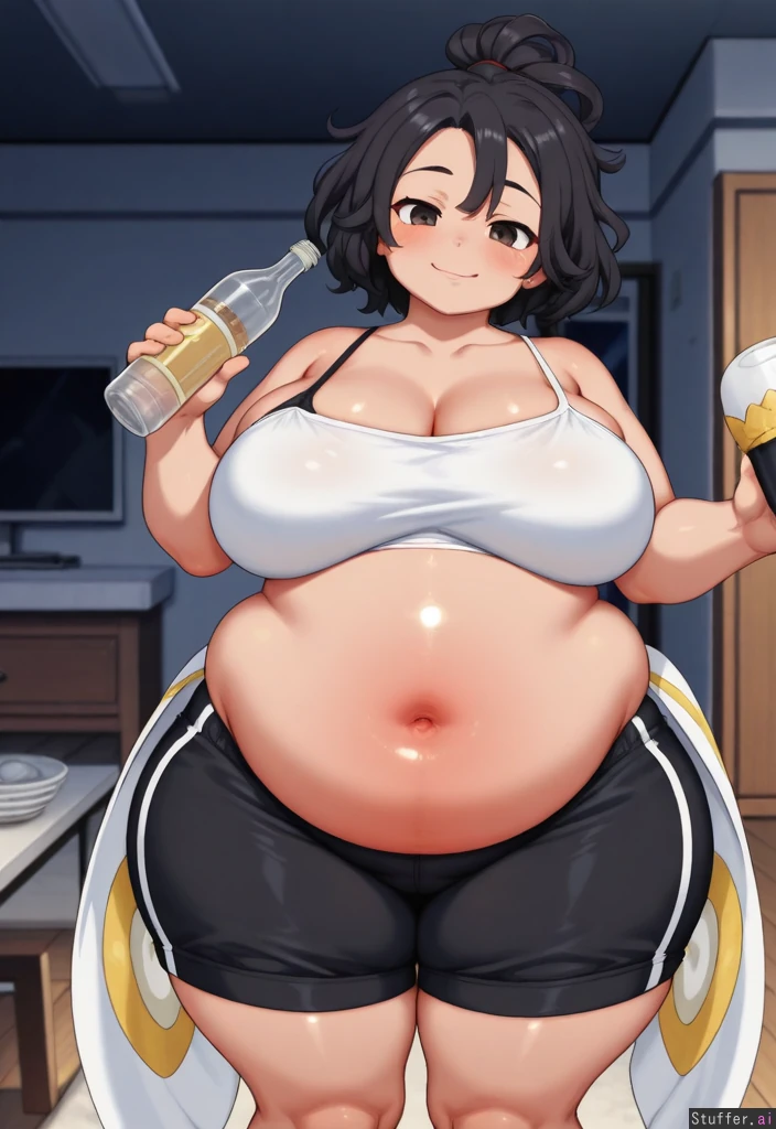 Morbid obese,heavy fat lower belly roll, folded soft belly, huge breasts, gigantic tights, fat back rolls, wide hips. Skinny face, lazy sloppy drunk expression, horny face Best quallity ( falling lower belly roll:1.9), belly over hips Standing looking at viewer, satisfied expression, holding bottle View from front, fat arms Latina with (ultra messy) black curly hair(her hair is so messy that is naturaly slowly forming thin dreadlocks), old clothes(loose white breast top, loose black sleep shorts ), lazy sloppy expression, brown skin, high quallity, Sitted on ground lazy posture almost layed in front of tv Dark room, cozy room, dishes and clothes on the floor.