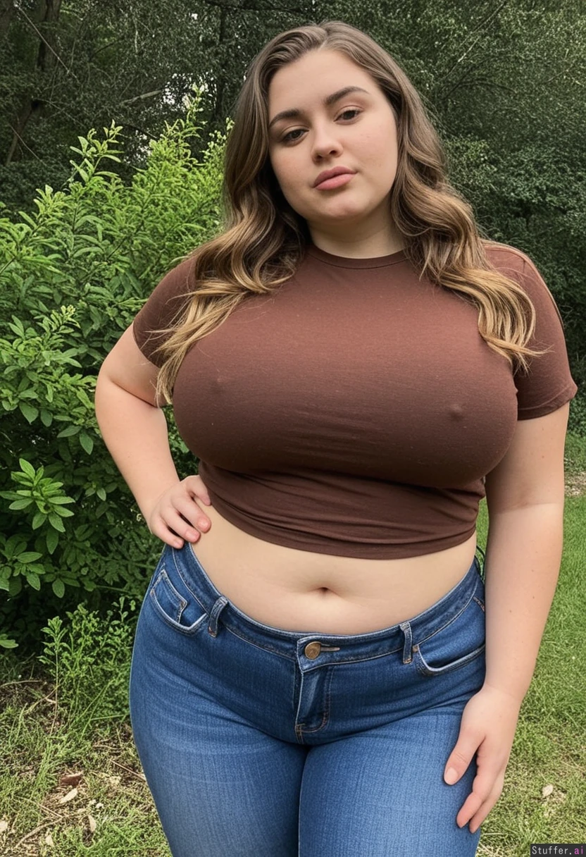 college girl, long very wavy darkblonde hair, without makeup, wide thick round nose, (very thick lips:1), brown small eyes, standing in nature, jeans, brown shirt (masculine:1.6) (curvy: 1.2) (fattening up: 1.0) (bigger fatter lethargic voluptuous thighs: 1.2)