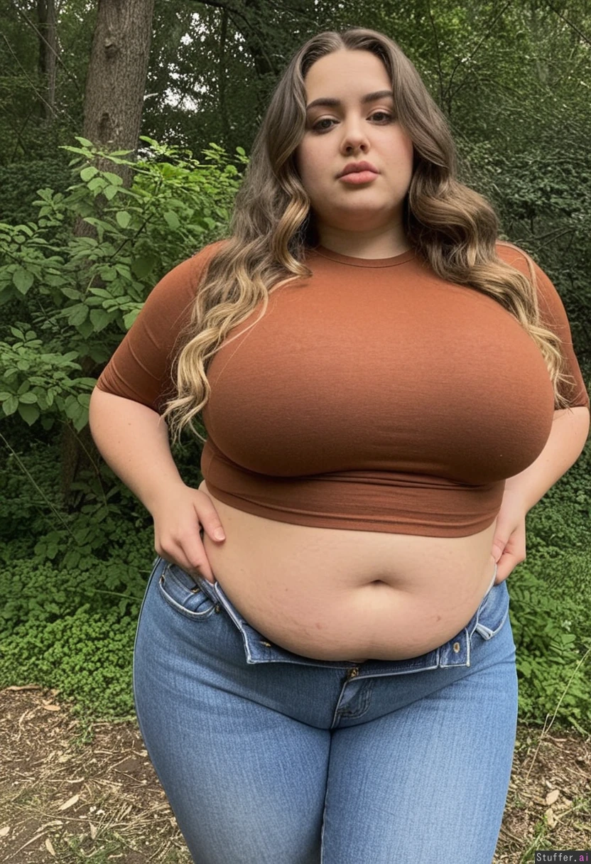 college girl, long very wavy darkblonde hair, without makeup, wide thick round nose, (very thick lips:1), brown small eyes, standing in nature, jeans, brown shirt (masculine:1.0) (curvy: 1.3) (fattening up: 1.2) (bigger fatter lethargic voluptuous thighs: 1.2)