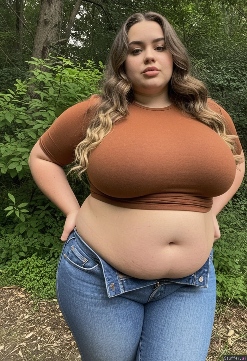 college girl, long very wavy darkblonde hair, without makeup, wide thick round nose, (very thick lips:1), brown small eyes, standing in nature, jeans, brown shirt (masculine:1.0) (curvy: 1.3) (fattening up: 1.4) (bigger fatter lethargic voluptuous thighs: 1.2)