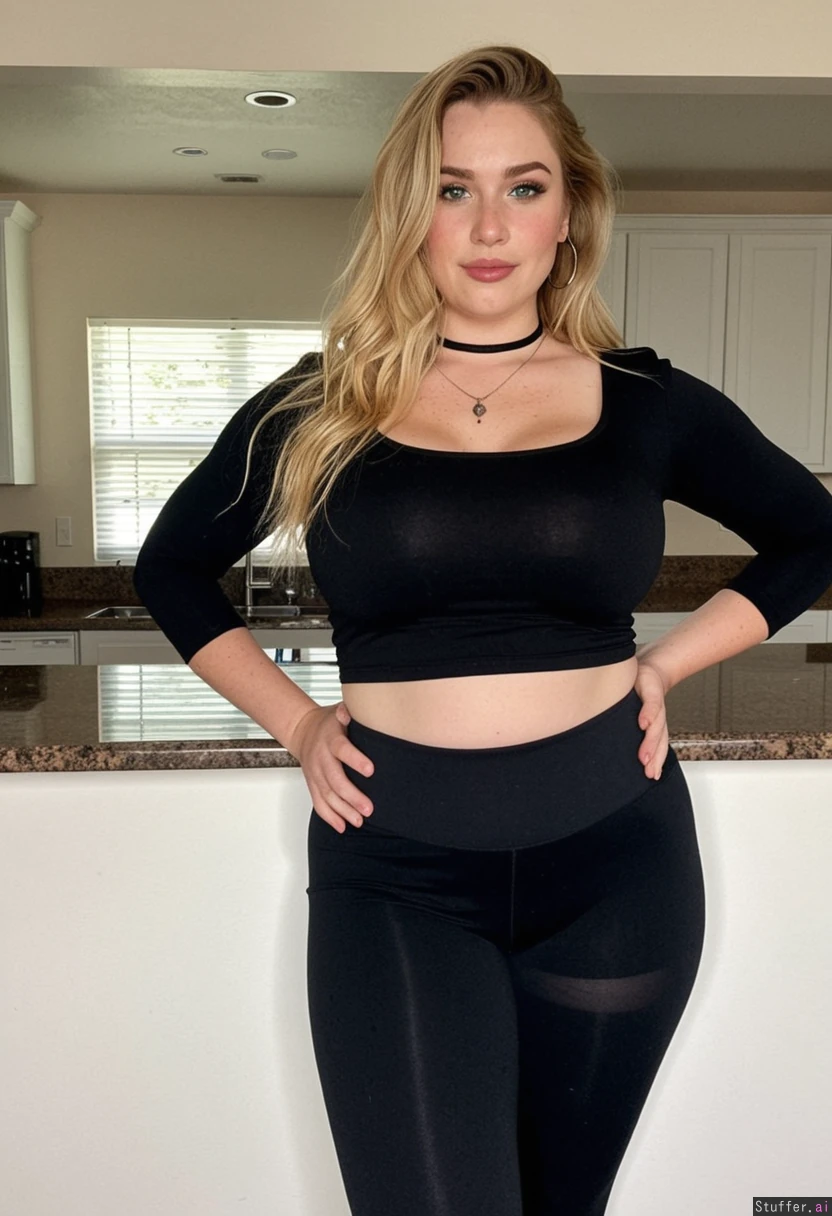 blonde solo girl, green eyes, freckles, long messy hair, sharp nose, high cheekbones, seductive smile, big full lips, double chin, eye-shadow, lipstick, blush, necklace, earrings (black tight crop top), (((black tight_low_waisted leggings))), hands on hips voluptueus, (extra-sized, super-sized), big_ass kitchen, (full_body shot), front view (chubby:0.7) (bigger fatter lethargic voluptuous thighs: 1.0) (fatter wider lethargic voluptuous hips: 1.0)