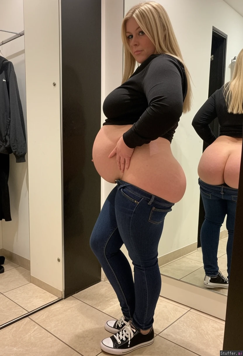 (full Body shot) long blonde hair, blue eyes, 33-years old woman wearing very tight, black hoodie, sneakers, trying too fit into a too small dark Jeans, struggling to get the pants over her Belly, ace filling Out, at the Dressing room, she has plump legs, meaty rump, checking Out her new curves while trying on new jeans, failing to close the zipper because of her fat booty