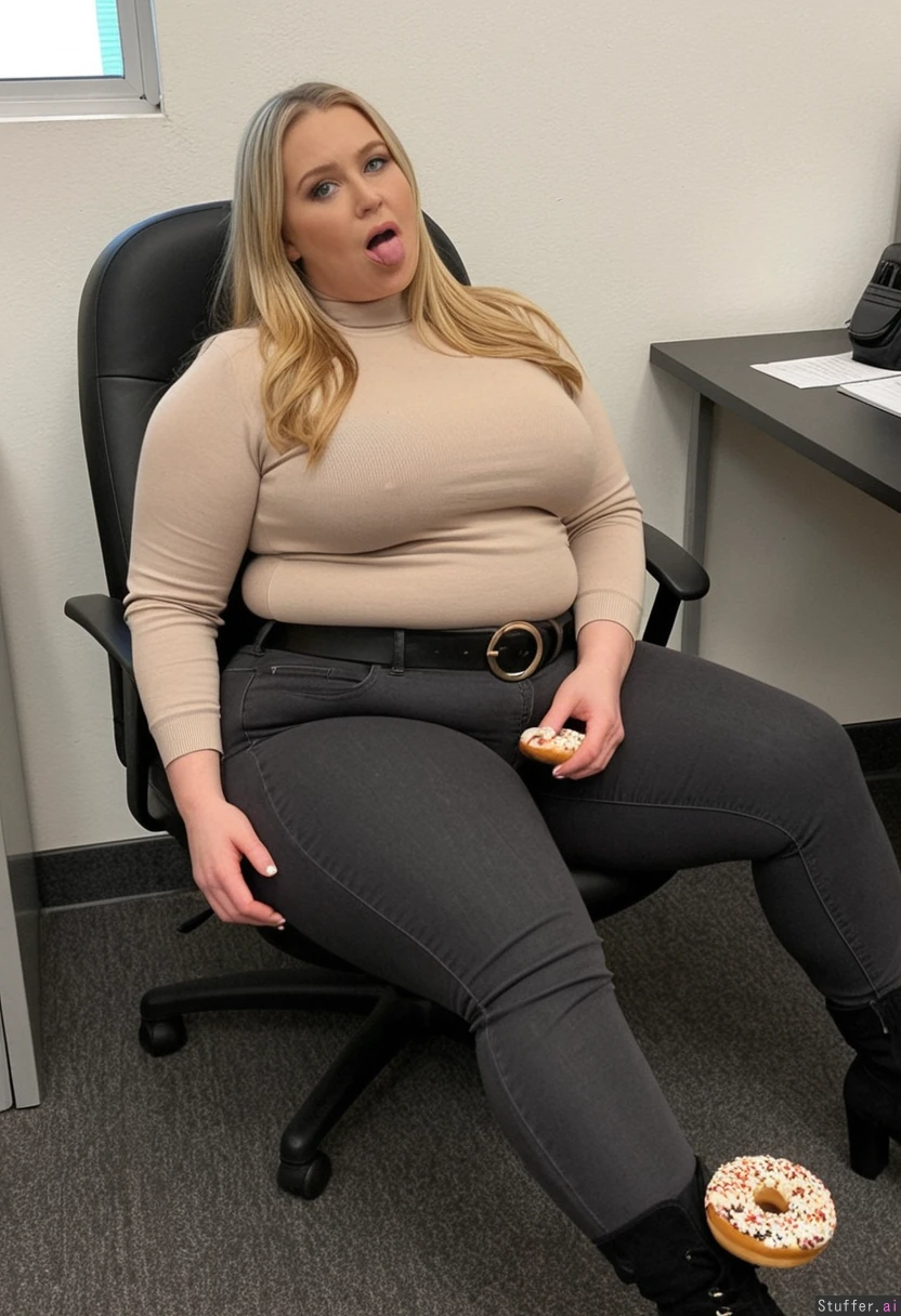 (full Body shot) long blonde hair, blue eyes, 33-years-old woman, feminine bottom-heavy figure, wearing tight, dark grey high waist jeans with a belt, a tight beige sweater, black boots, face filling Out, sitting at the office, eating Donuts, she has plump legs, meaty rump, enjoying food, mouth full of icing, weight_gain Fatter(0.6)