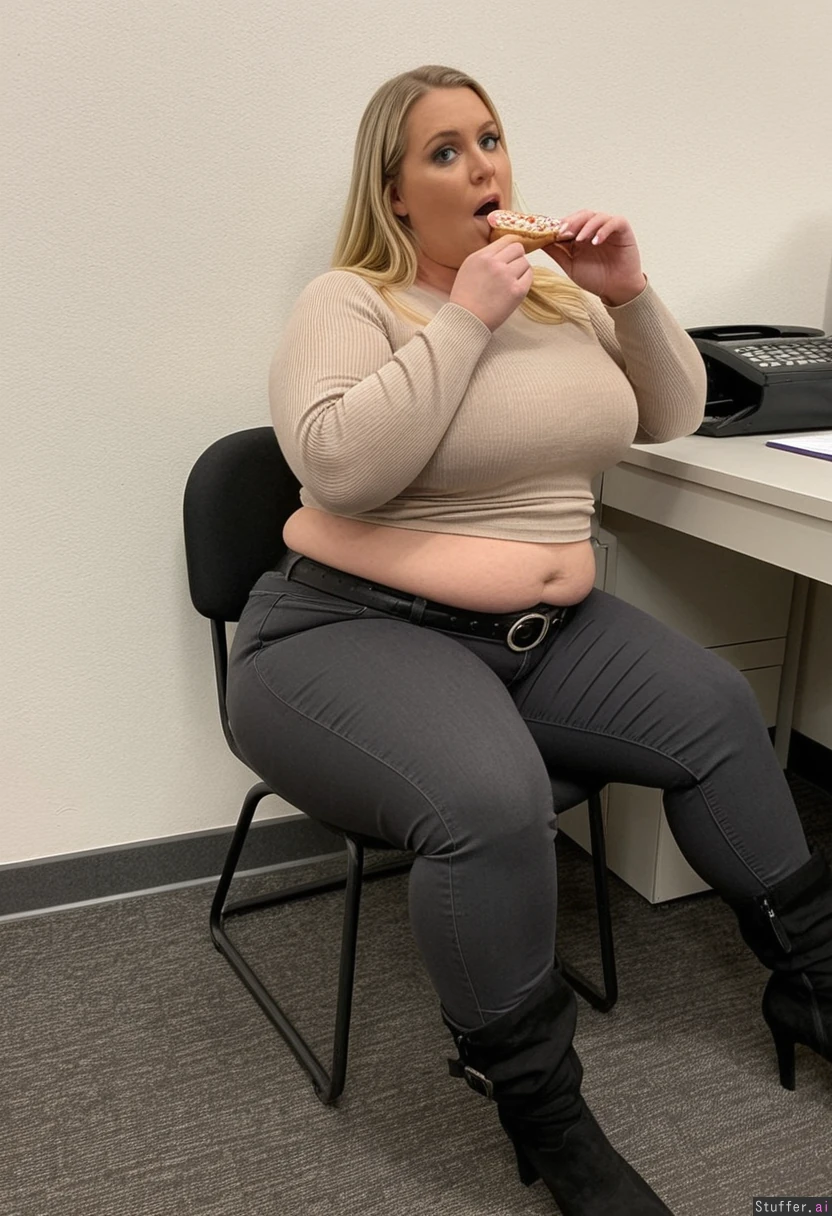 (full Body shot) long blonde hair, blue eyes, 33-years-old tall wide woman, feminine bottom-heavy build, wearing tight, dark grey high waist jeans with a belt, a tight beige sweater, black boots, face filling Out, sitting at the office, eating Donuts, she has plump legs, meaty rump, enjoying food, mouth full of icing, weight_gain Fatter(1.7)