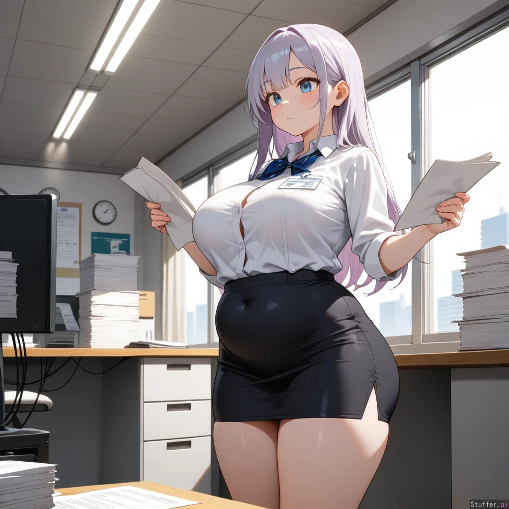 masterpiece, highest quality, high res, hdr, uhd, 8k, masterpiece, high definition, incredible shading, incredible lighting, 1woman, long light purple hair, light blue eyes, cute face, tall height, white button down shirt, name tag, black business skirt, medium breast, big boobs, chubby covered belly, plumper thighs, narrow hips. Standing holding paper documents, confident, working, Office setting, daytime, bright, day time.