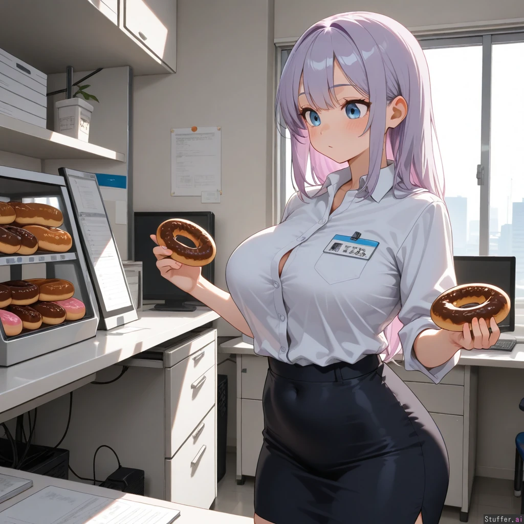 masterpiece, highest quality, high res, hdr, uhd, 8k, masterpiece, high definition, incredible shading, incredible lighting, 1woman, long light purple hair, light blue eyes, cute face, tall height, white button down shirt, name tag, black business skirt, medium breast, big boobs, covered potbelly, plumper hips, narrow hips. Standing holding frosted donut, confident, working, Office setting, daytime, bright, day time.
