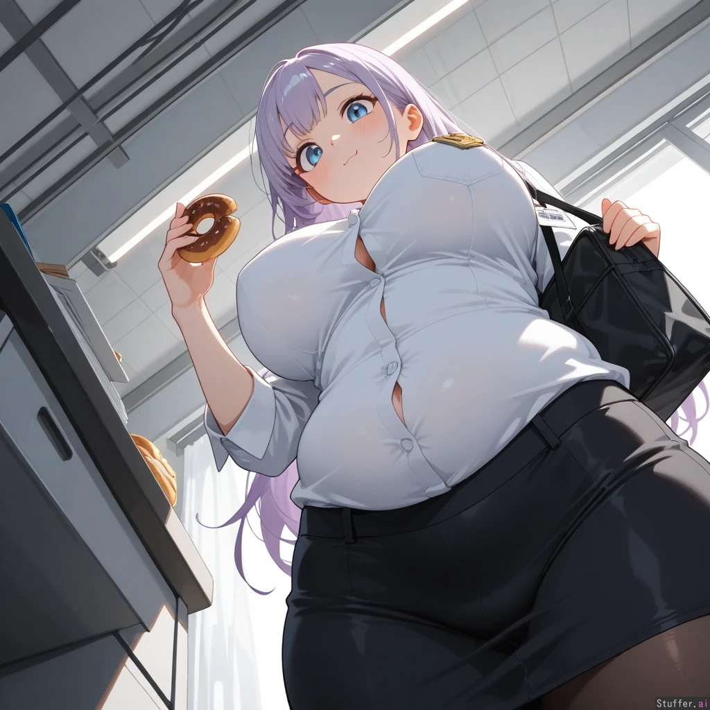 (Below side POV), masterpiece, highest quality, high res, hdr, uhd, 8k, masterpiece, high definition, incredible shading, incredible lighting, 1woman, long hair, long light purple hair, light blue eyes, cute face, tall height, white button down shirt, name tag, black business skirt, medium breast, big boobs, covered potbelly, her belly has grown, plumper hips, narrow hips. Standing holding and eating a frosted donut, confident, working, looking right. Office setting, daytime, bright, day time.