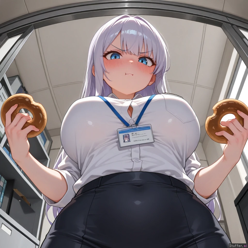 (Below side POV), masterpiece, highest quality, high res, hdr, uhd, 8k, masterpiece, high definition, incredible shading, incredible lighting, 1woman, long hair, long light purple hair, light blue eyes, cute face, tall height, white button down shirt, name tag, black business skirt, medium breast, big boobs, covered potbelly, her belly is bigger, plumper hips, narrow hips. Standing holding and eating a frosted donut, confident, working, looking at viewer, (((massive blushing face))), tsundere, frowning. Office setting, daytime, bright, day time.