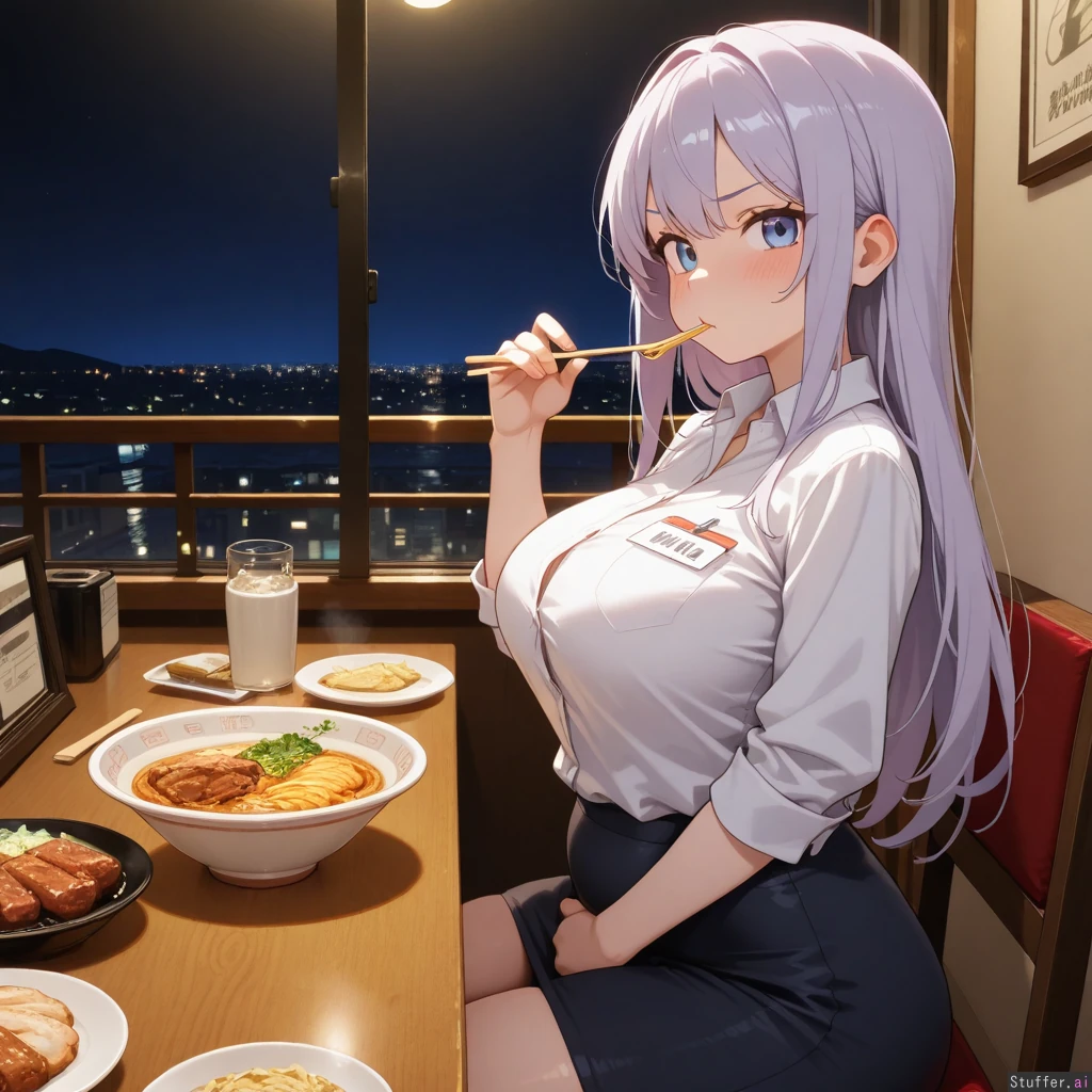 (side view with focus on waist), masterpiece, highest quality, high res, hdr, uhd, 8k, masterpiece, high definition, incredible shading, incredible lighting, 1woman, long hair, long light purple hair, light blue eyes, cute face, tall height, white button down shirt, name tag, black business skirt, medium breast, big boobs, covered potbelly, her belly is bigger, plumper hips, narrow hips. Sitting on chair at table, eating a massive feast of fattening ramen and meat, blushing, chewing, saying with mouth full that she doesnt want food to go to waste, romance, tsundere, frowning serious, looking at viewer. Restaurant setting, nighttime , dim lights, night