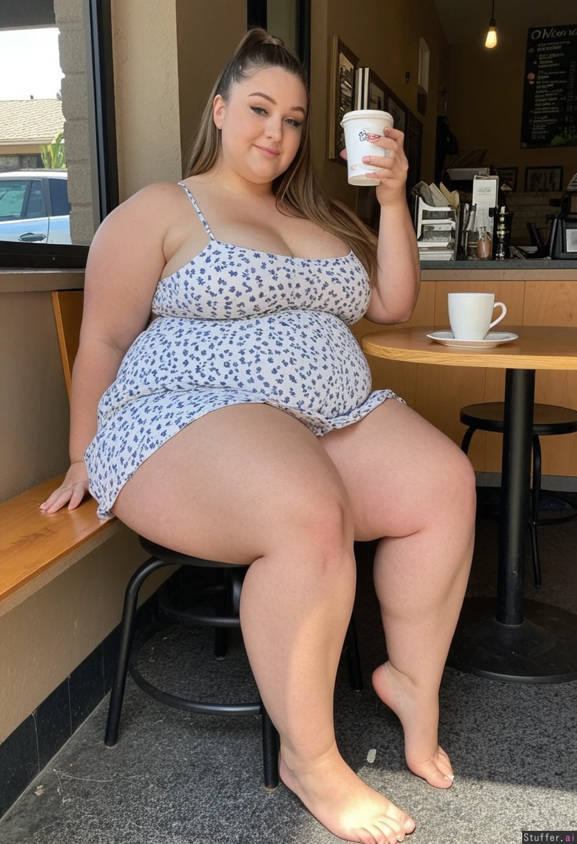 a full body portrait of an impossibly beautiful thicc, hyper-attractive instagram model in a casual sundress at a cafe. She is enjoying breakfast and coffee. Shes curvy and chubby. Shes short and voluptuous and her belly is narrow. she has chubby arms and big (fat legs:1.5). she has very narrow shoulders, wide hips, and a big butt. her face is skinny and lean. ((olivia wilde):1.1), (ariana grande), (bbw),