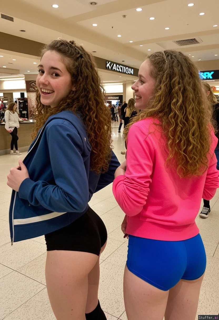 (Exceptionally petite:1.6). (Peppy 18 year old beautiful girls:1.2). Frizzy hair. Freckles Wearing a jacket, spandex top and spandex shorts. Pale skin. (Very cute face:1.2). Hanging out at the mall with her girlfriends. Laughing nervously. Her girlfriends are surprised. (Perfectly round butt). Candid. Full body.