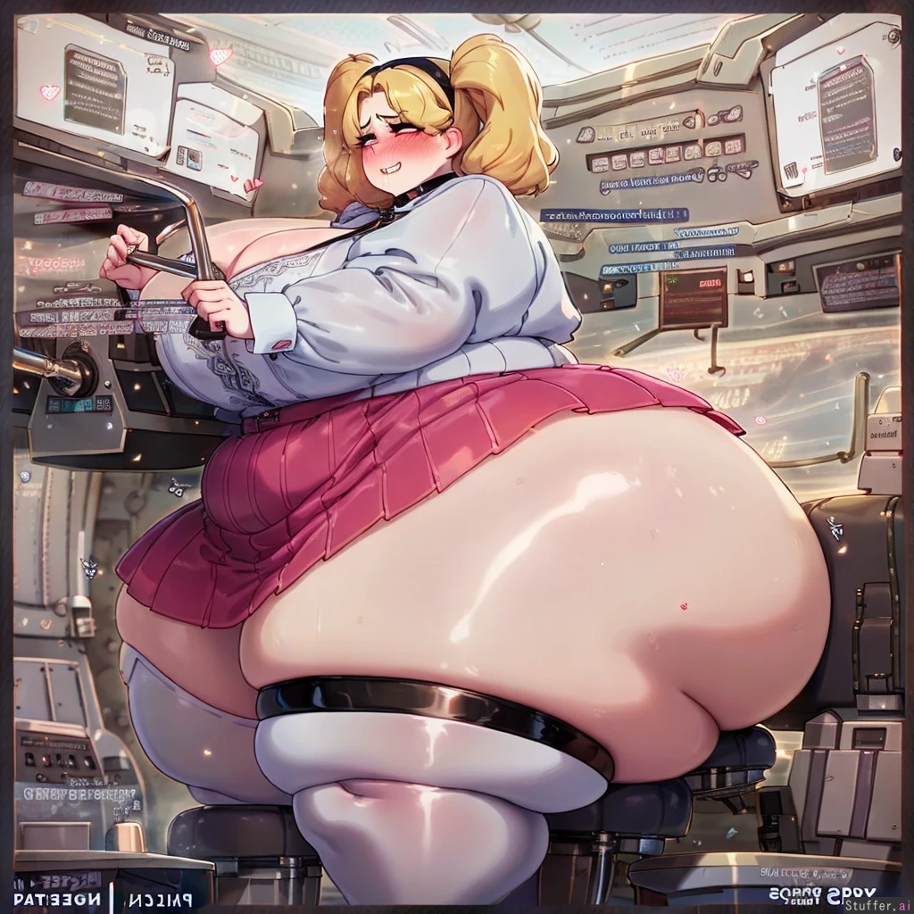 best quality, high rating, 8k uhd, hdr, absurdres, hyper detail, highly detailed, intricate detail, realistic best quality, high rating, UHD, HDR, smooth texture, 4k, icecake, c.cu background, detailed textures, expressive, definition lines, soft colors, full color, photorealistic, realistic lighting, highly detailed face, beautiful face, highly detailed eyes, glossy realistic skin, gorgeous, majestic, cute, highly detailed background, motion lines,icecake, bluethebone, c.cu, rikose, betterwithsalt,blushyspicy, spellsx, sssonic2, rizdraws,, in front of control panel , ((blushing, eyes looking up, biting her bottom lip)), (((skindentation))), (hyper ssbbw:1.4) (((wide hips))), ((((overflowing massive thighs)))), ((((gigantic hips)))), (thick thighs), (muffin top), , ((plump)), plump thighs , deep navel, , ((chubby belly)), underbelly, slim face, (((ssbbw, blonde pigtails,))), (stuffed belly), round ass, bimbo, hairband, exhausted, exploding hearts, blushing, tsundere expression, ,, (horny), ((tipsy)), panting, , ))), , , cleavage, hands on lever: 1.5)), Button white blouse, ((short tight pink skirt)), (strained buttons), thigh highs, choker, , (fat ass, ( armored cockpit:1.6) (hyper ass, gigantic thighs:1.4) (back profile) detailed ass:1.0), (thick thighs:1.1), (chubby arms:1.0), , (gigantic ass:1.6) Tall Mature, woman, MILF 30 year old, luscious lips Sitting on stool (( inside steampunk tank ))(( operating tank )) (( dashboard controls background ))hands on joystick ((grabbing lever )) ((pulling down lever)) (( metal pipes leaking steam)) (( pipes bursting steam background)) ((tank cockpit violently shaking)) (( aggressively stepping on gas pedal)) inside tank cockpit)) controlling steam punk vehicle (( operating cockpit )) (( inside cockpit)) (( controlling tank )) ((crazy psychotic laughing)) (( yandere ))