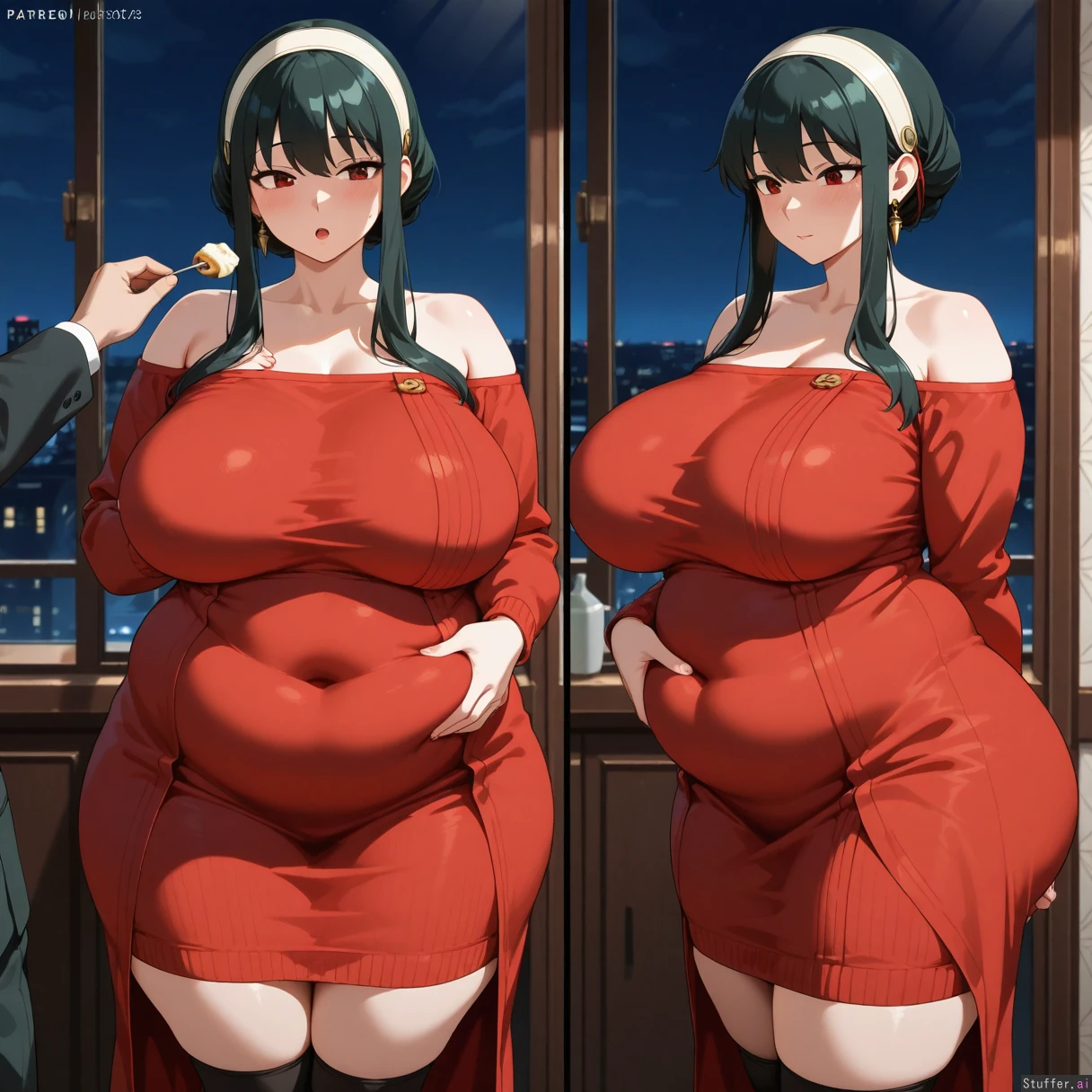 night,{dark}, masterpiece, hyper resolution, beautiful face, best quality, high rating,2person Yor Briar, mature,(tall figure) ,,white hairband,(long legs:1.0),(mature style),(obese belly:1.0),(overweight:1.0),(huge breasts:1.0),eyes half closed,{{soft breasts}},(huge butt:1.0){{soft cheeks}}, Loid Forger(SpyXFamily),touching. her breast,touching her belly,feeding her,hugging her,