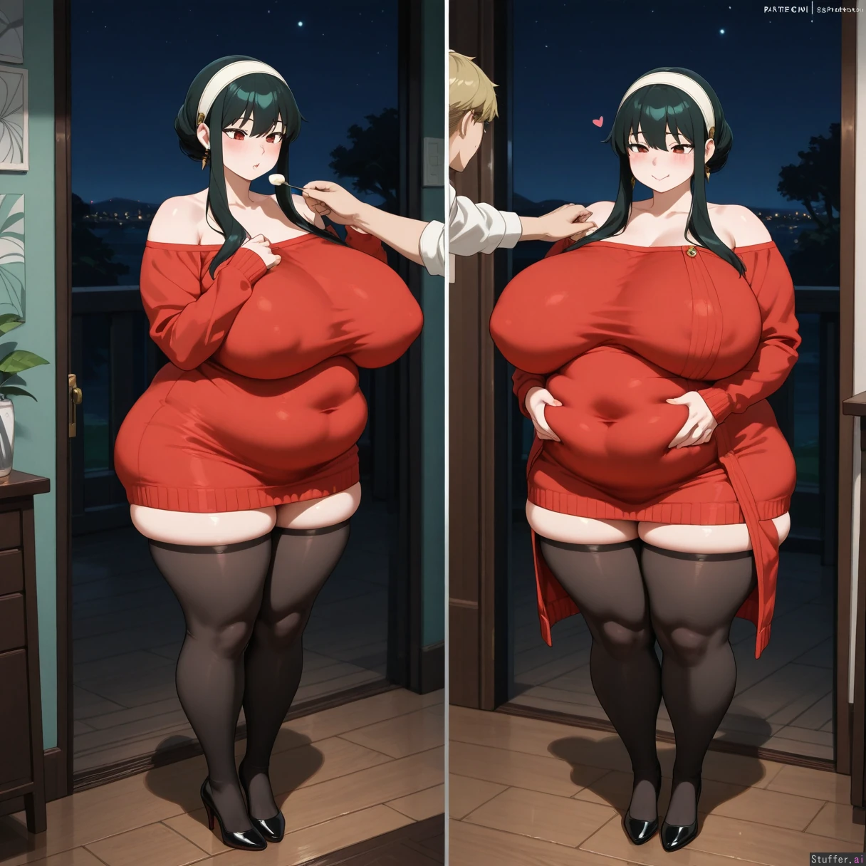 night,{dark}, masterpiece, hyper resolution, beautiful face, best quality, high rating,2person Yor Briar, mature,(tall figure) ,,white hairband,(long legs:1.0),(mature style),(obese belly:1.0),(overweight:1.0),(huge breasts:1.0),eyes half closed,{{soft breasts}},(huge butt:1.0){{soft cheeks}}, {{Loid Forger(SpyXFamily)}},touching. her breast,touching her belly,feeding her,hugging her,full body