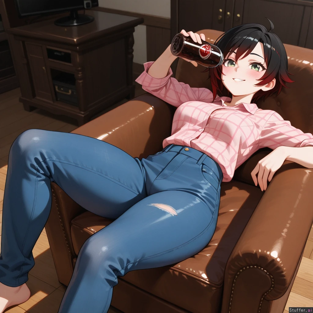(High resolution, highest quality, 4k, hdr, uhd, masterpiece, incredible shading and lighting) 1 female, solo, (RWBY_Ruby_Rose), blue jeans, pink button up flannel shirt, thick thighs, wide waist, blushing, mischievous smile, drinking 2 liter cola, (located in living room, sitting in brown recliner, laying back), (viewed from above)