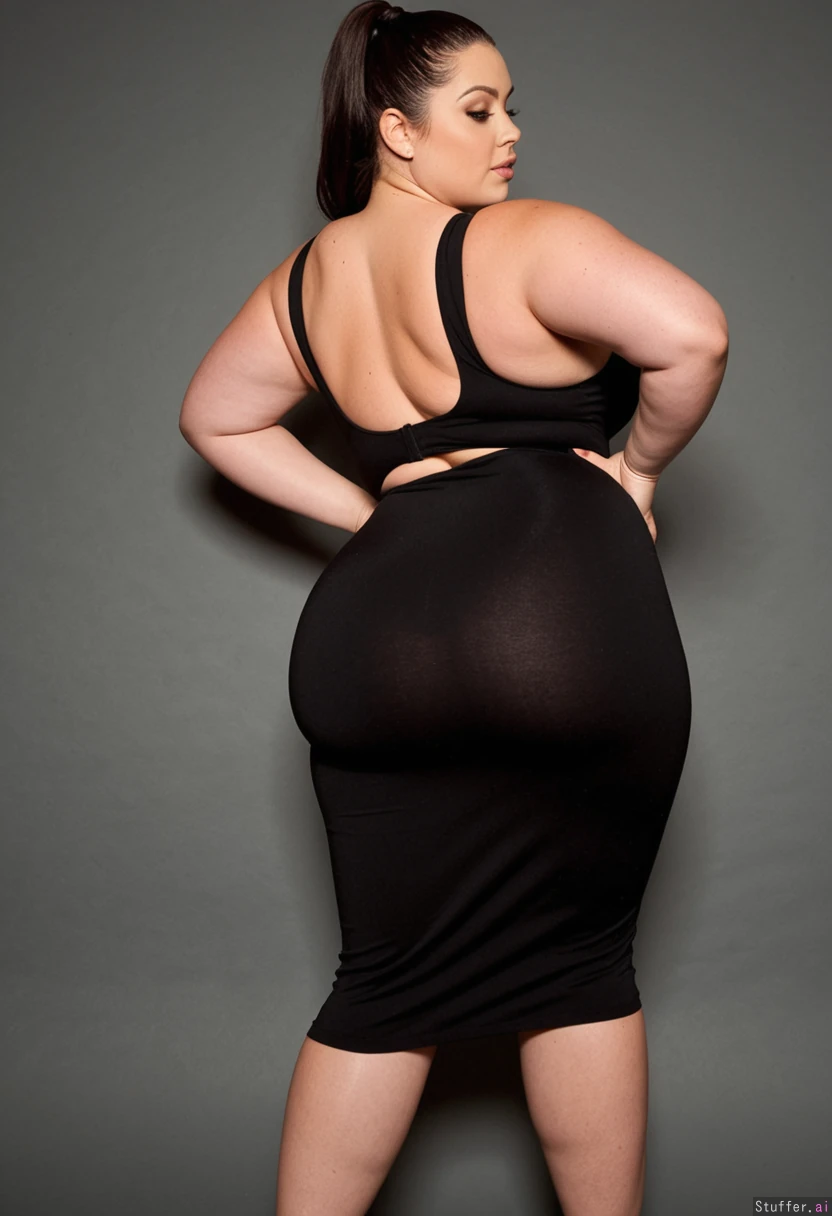 gorgeous woman, curvy, fat, wide hips, love handles, long tight dress, full body view, back view,