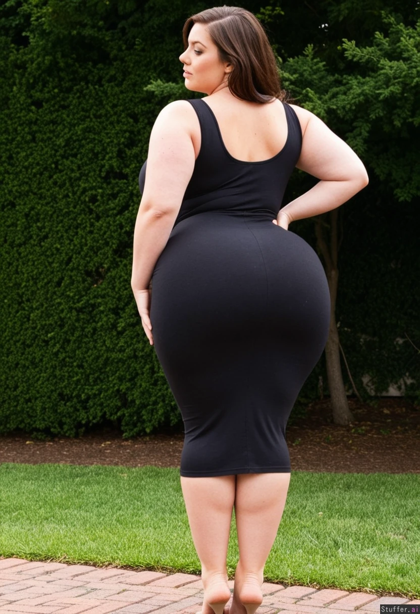 gorgeous woman, curvy, fat, wide hips, love handles, long tight dress, full body view, back view, outside,