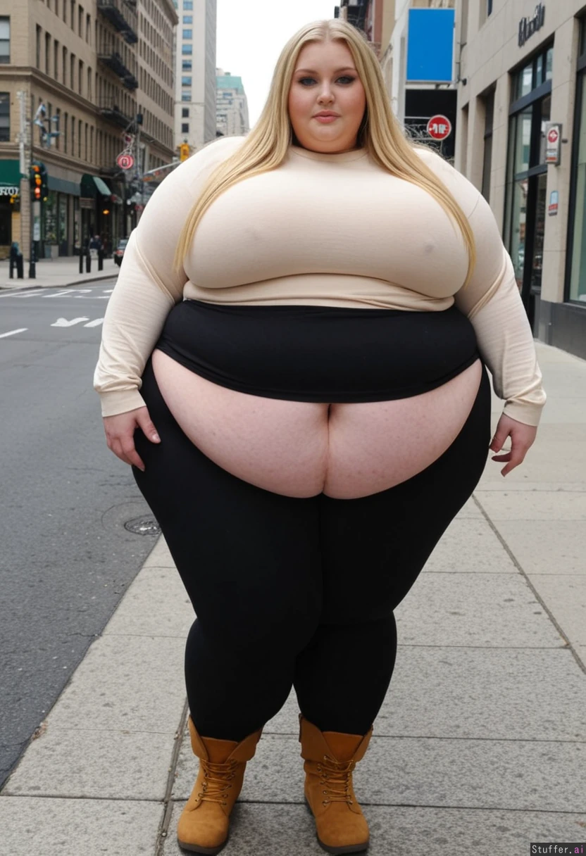 Fully dressed, long blonde hair, chubby gorgeous face, blue eyes, 33-years-old voluptuous woman, she is bottom-heavy, her feminine curves are packed tightly into her oversized black leggings, beige sweater, SSBBW, thick thighs, wide hips, boots, Love handles, Walking through the City (SSBBW, hyper obese, weight gain, expansion, gigantic legs, gigantic wide hips)
