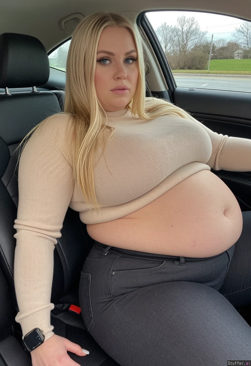 Long blonde hair, blue eyes, 33-years-old , tall wide voluptuous woman, bottom-heavy feminine build, wearing very tight, dark grey high waist jeans,a beige sweater, black boots, sitting in her car, driving, wide face, she has fat, still toned legs, meaty rump, cute belly roll, driving with a tired Look in her eyes