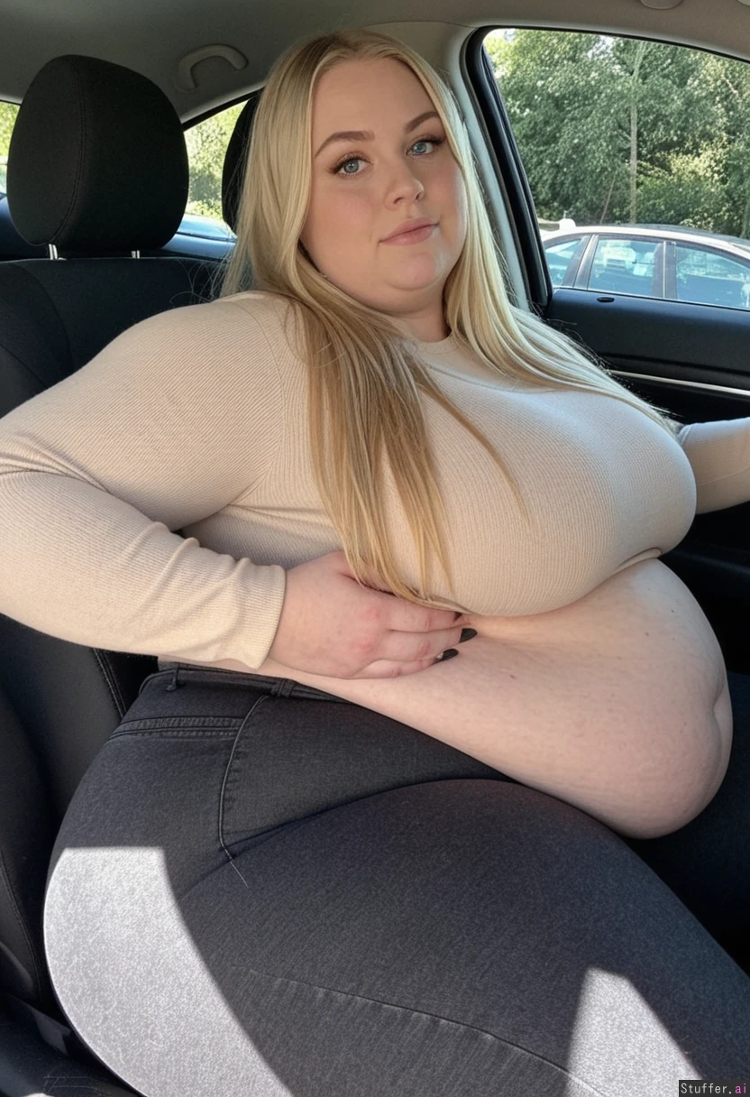 Long blonde hair, blue eyes, 33-years-old, tall wide voluptuous obese woman, bottom-heavy feminine build, wearing very tight, dark grey high waist jeans,a beige sweater, black boots, sitting in her car, driving, wide face, she has hyper wide hips, extra thick legs, meaty rump, love handles, driving with a tired Look in her eyes, weight gain visible