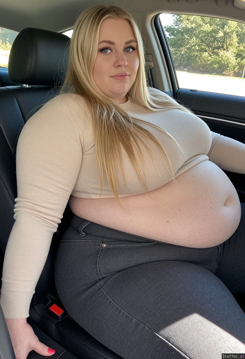 Full body shot, Long blonde hair, blue eyes, 33-years-old, tall wide voluptuous obese woman, bottom-heavy feminine build, wearing very tight, dark grey high waist jeans,a beige sweater, black boots, sitting in her car, driving, wide face, she has hyper wide hips, extra thick legs, meaty rump, love handles, driving with a tired Look in her eyes, weight gain visible, her massive body taking up a lot of space on her seat, feedee