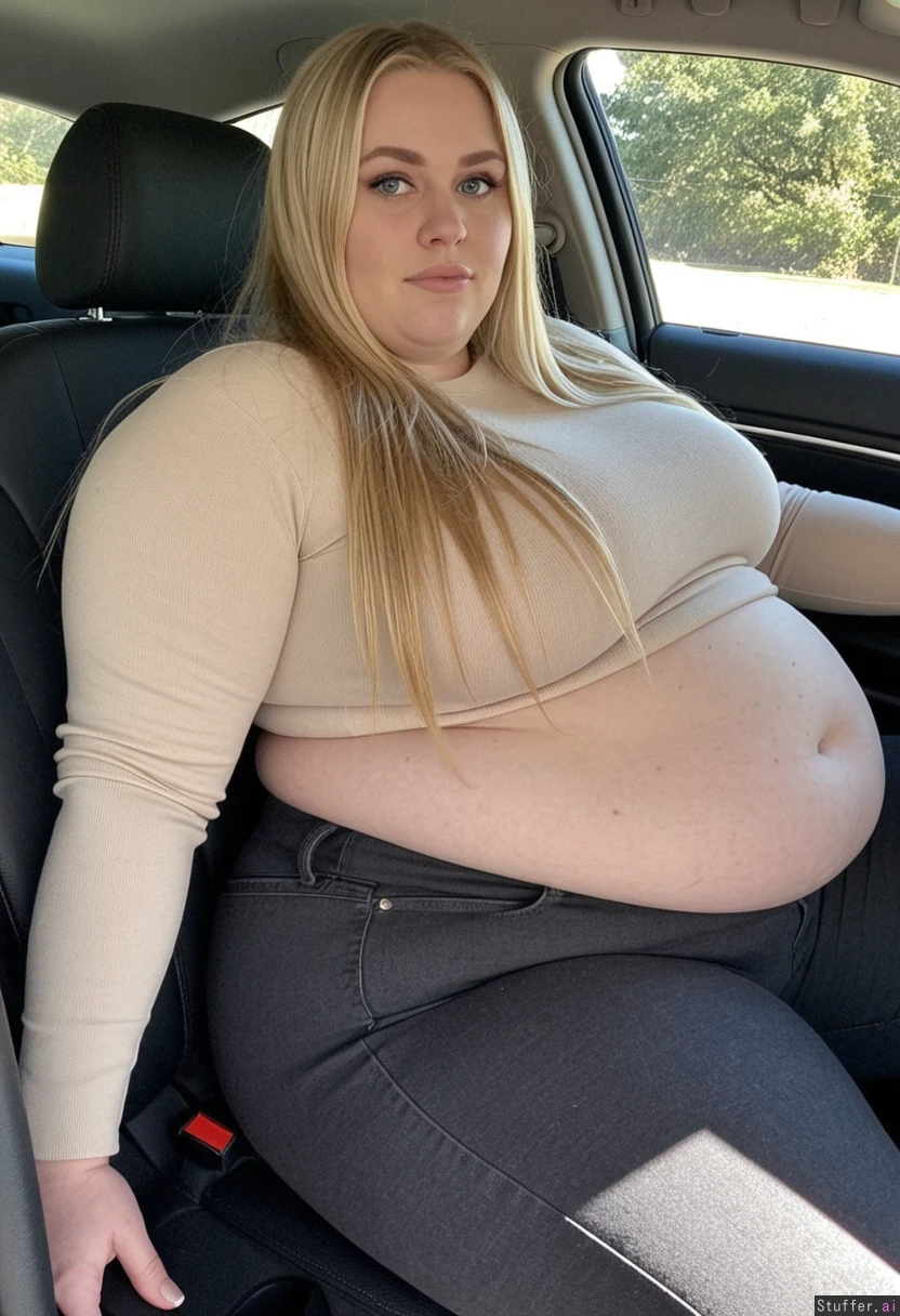 Full body shot, Long blonde hair, blue eyes, 33-years-old, tall wide voluptuous obese woman, bottom-heavy feminine build, wearing very tight, dark grey high waist jeans,a beige sweater, black boots, sitting in her car, driving, wide face, she has hyper wide hips, extra thick legs, meaty rump, love handles, driving with a tired Look in her eyes, weight gain visible, her massive body taking up a lot of space on her seat spiling over at the sides, feedee