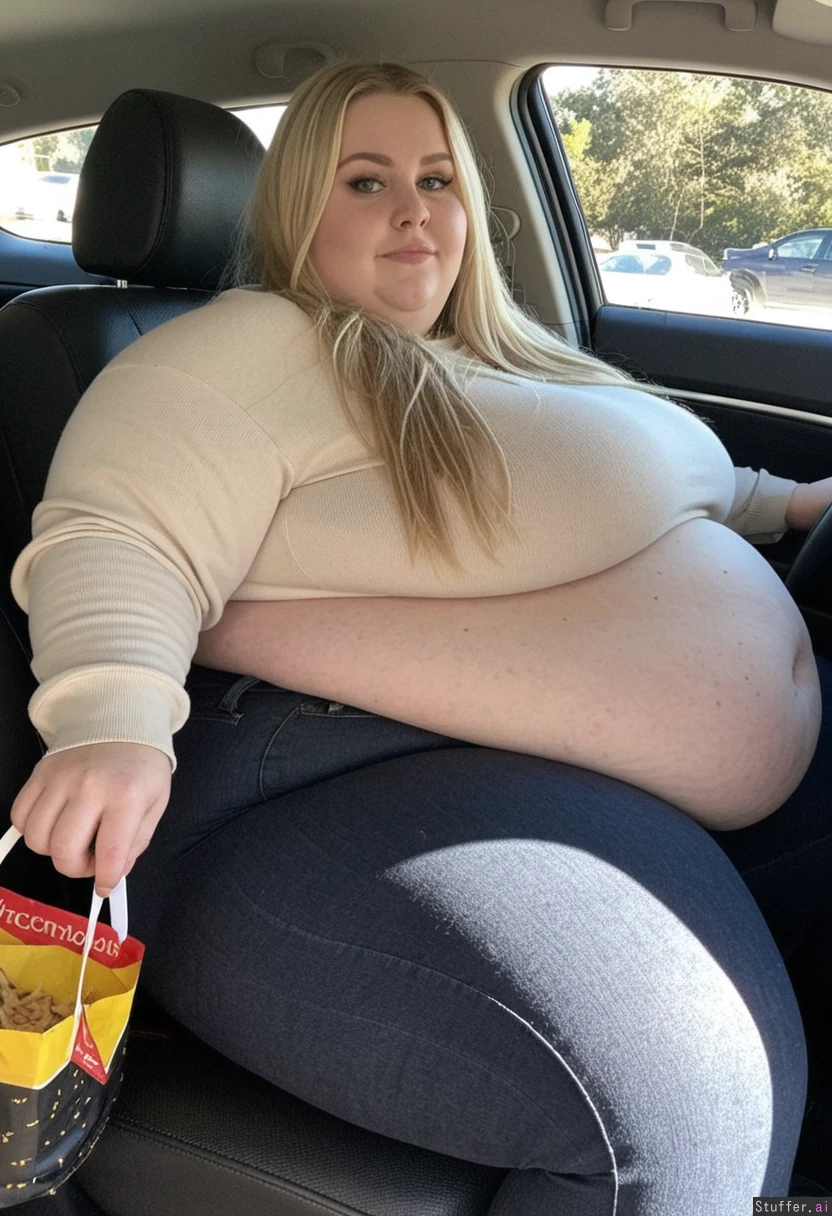 Full body shot, Long blonde hair, blue eyes, 33-years-old, tall wide voluptuous obese ssbbw woman, bottom-heavy feminine build, wearing very tight, dark grey high waist jeans,a beige sweater, black boots, sitting in her car, driving, wide face, she has hyper wide hips, extra thick legs, meaty rump, love handles, driving with a tired Look in her eyes, weight gain visible, her massive body taking up a lot of space on her seat, thighs spiling over at the sides, feedee, a bag of fattening food from mcdonalds next to her
