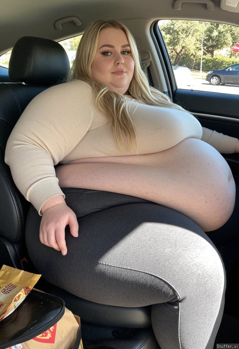 Full body shot, Long blonde hair, blue eyes, 33-years-old, tall wide voluptuous morbidly obese ssbbw woman, bottom-heavy feminine build, wearing very tight, dark grey high waist jeans,a beige sweater, black boots, sitting in her car, driving, wide face, she has hyper wide hips, extra thick legs, meaty rump, love handles, driving with a tired Look in her eyes, weight gain visible, her massive body taking up a lot of space on her seat, thighs spiling over at the sides, feedee, a bag of fattening food from mcdonalds next to her, massive, expanding blubber, humongous thighs and ass